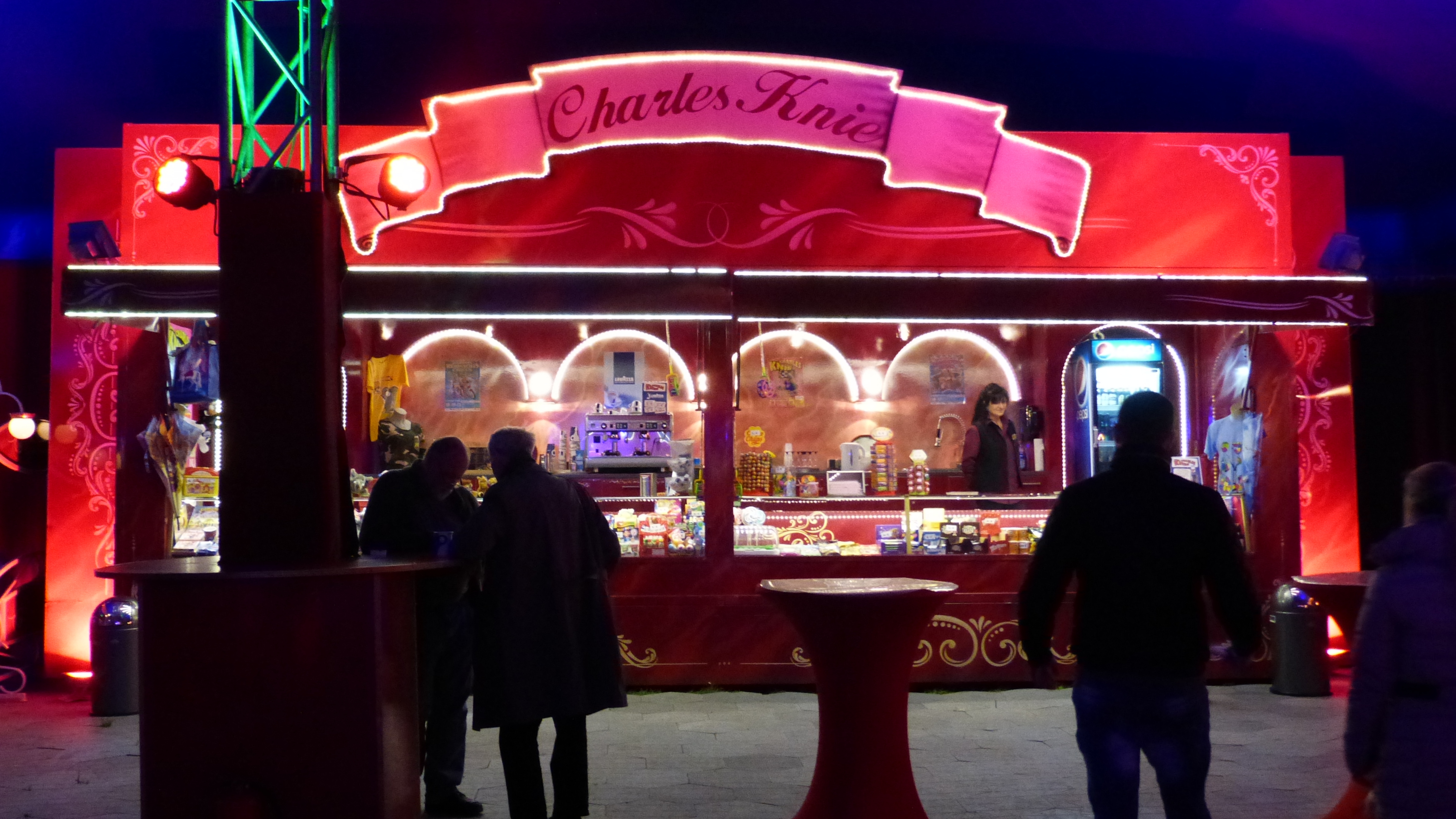 Schönes Ambiente schon beim Eintritt in das Vorzelt des Chapiteau Bereits beim Eintritt in das Vorzelt, in dem sich die Besucher vor der Vorstellung und in der Pause verköstigen lasen können ist klar, es ist nicht der übliche Zirkus. Verlegter Kunststoffboden, anstatt Kies, Sägemehl oder anderes, Wandbehänge mit Bildern der Artisten und rote Vorhänge machen ein angenehmes Ambiente. Und dann das Chapiteau mit 1438 Einzelsitzplätzen und Lehne. So lässt es sich gut und bequem beim etwas mehr als zweistündigen Programm sitzen und die achtzehn Zirkusnummern voll genießen. Und das Showbalett, die Artisten und Tiere werden mittels der modernen Lichtanlage ins rechte Licht gerückt. Bezaubernd und effektvoll mit künstlichem Nebel in allen Farben unterstrichen. Dazu was selten gewordenes, eine Live-Zirkuskapelle mit acht Musikern. Die Kosten dürften dafür verantwortlich sein, dass es sie in den meisten Zirkussen seit langem nicht mehr gibt. Eigentlich schade.
