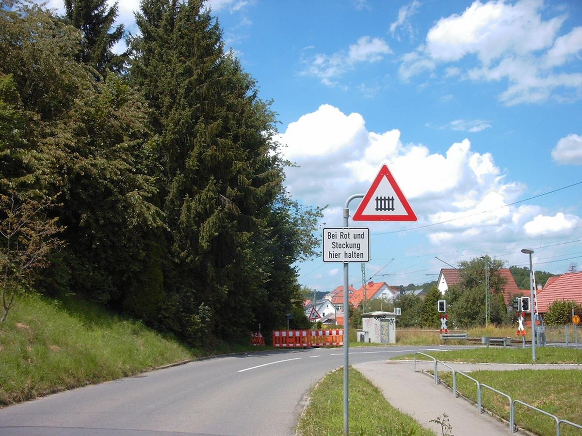 hier halten“ in Wannweil bedeutet. Bei ROT ist die Rotphase der Ampel des Bahnüberganges