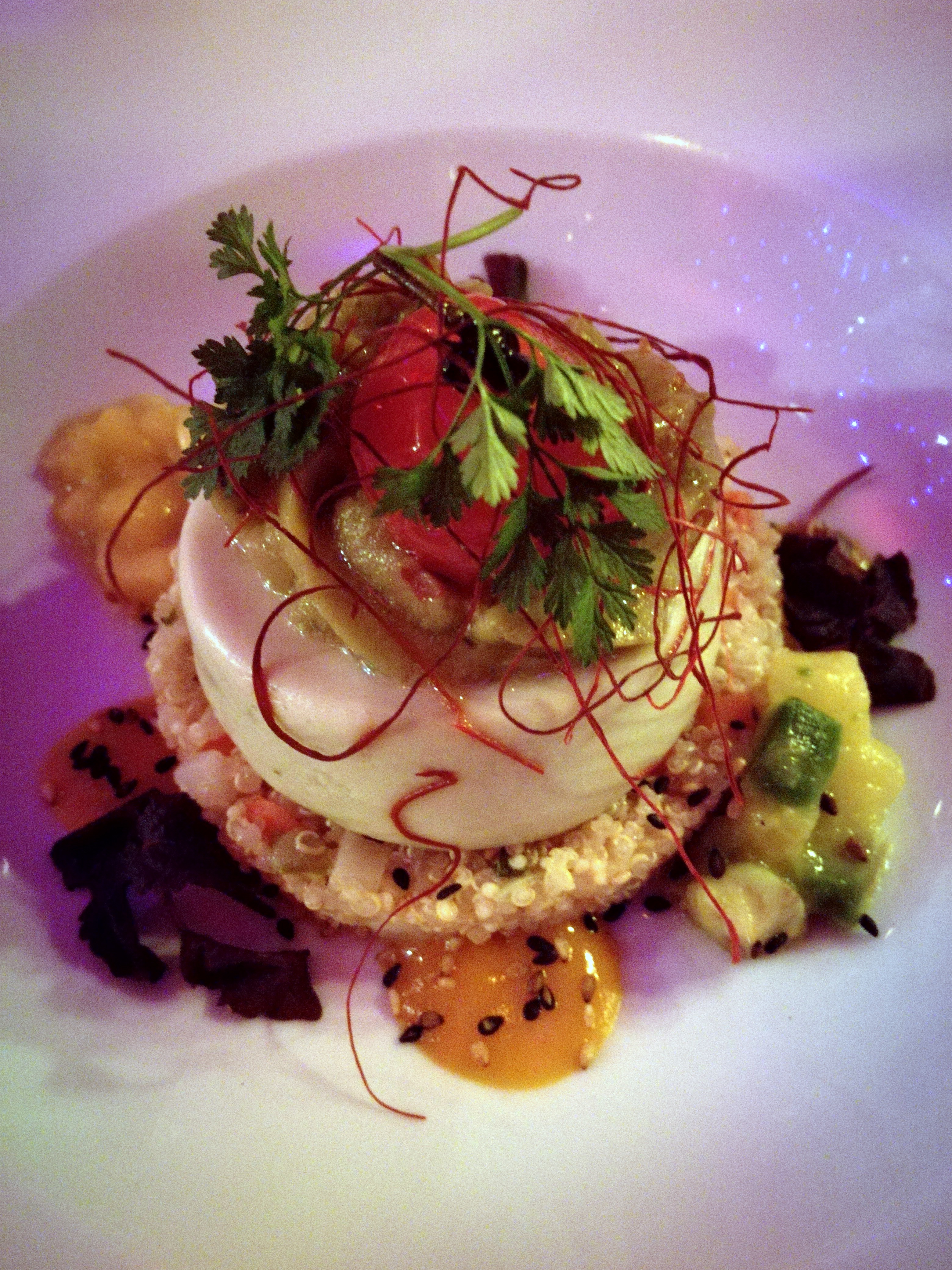 mit gepickelten Karottenwürfeln und Topinambur-Emulsion. Als Hauptgang